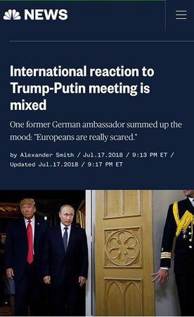 就在特朗普改口时,美国NBC梳理了一下特朗普相信普京不相信美国情报机构在全世界引发的反应。其中欧洲的情绪是“惶恐”,俄罗斯的情绪是“胜利”。 俄罗斯媒体《俄罗斯报》说,西方孤立俄罗斯的努力失败了!
