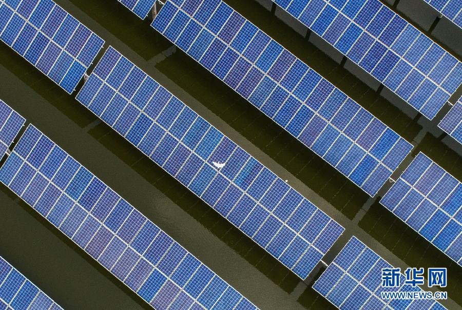 一只白鹭从光伏板上飞过(6月21日摄)。浙江省湖州市和孚镇的“渔光互补”光伏发电项目建设在4200多亩鱼塘上,40多万块太阳能光伏板下养殖小龙虾和青虾等水产,千亩鱼塘与绿色光伏电站构成一幅和谐的生态美景图。 新华社记者 徐昱 摄