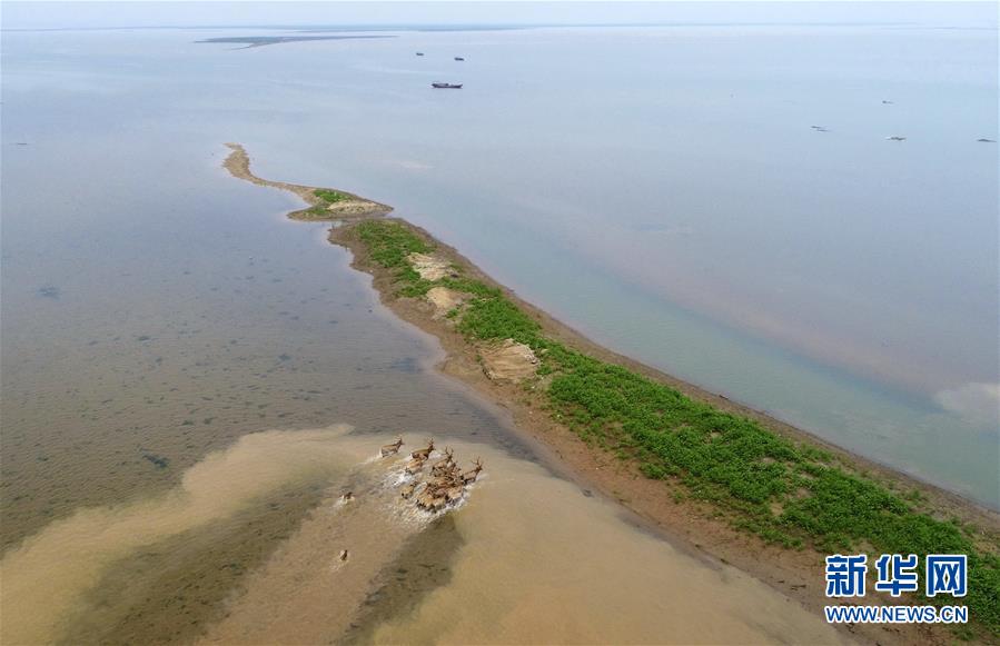 被野放的麋鹿在江西鄱阳湖湿地奔跑(4月3日无人机拍摄)。据国家林业和草原局统计,截至2018年7月8日,我国共有国际重要湿地57个、湿地自然保护区602个、国家湿地公园898个,湿地生态系统中有湿地植物4220种、动物2312种,湿地?;ぢ蚀锏?9.03%。 新华社记者 周密 摄