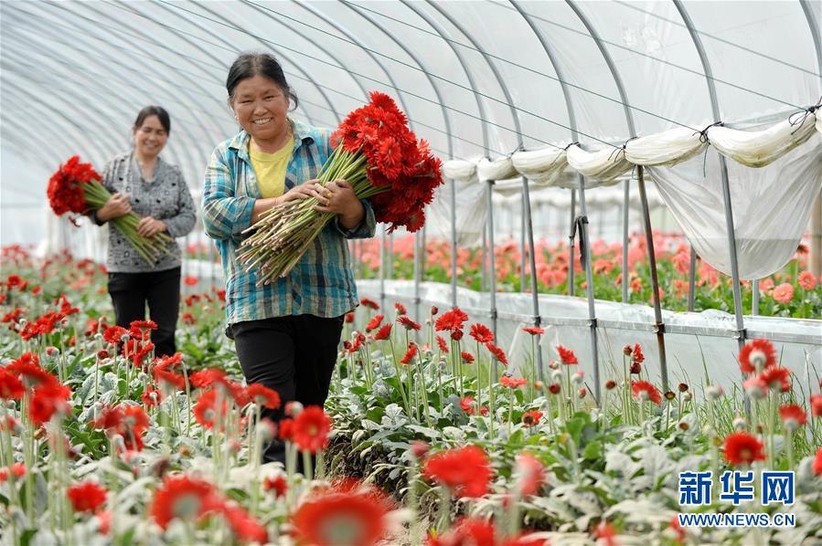 在江西省靖安县水口乡桃源村,当地农户在非洲菊种植基地采摘花卉准备外销(2017年4月20日摄)。坐拥整个鄱阳湖流域、正处工业化发展中期的江西,将为长江经济带生态文明建设寻找答案,给全国生态文明建设摸索标准,探索一条通向美丽中国的绿色崛起之路。 新华社记者 彭昭之 摄