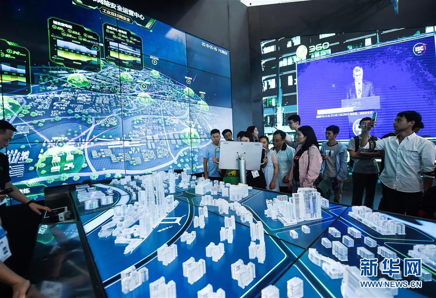 在贵州省贵阳市举行的2018中国国际大数据产业博览会上,参观者在参观城市网络安全运营中心(5月26日摄)。本次数博会上,无人驾驶、虚拟试衣镜等“黑科技”引人关注。 新华社记者 陶亮 摄
