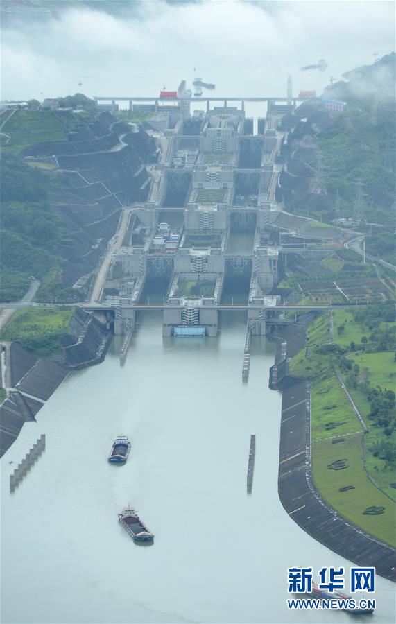 船舶有序通过三峡五级船闸(2017年10月4日摄)。截至2017年9月底,三峡船闸、葛洲坝船闸累计客货通过量双双突破1亿吨,有效发挥了三峡枢纽航运效益。 新华社发(郑家裕 摄)