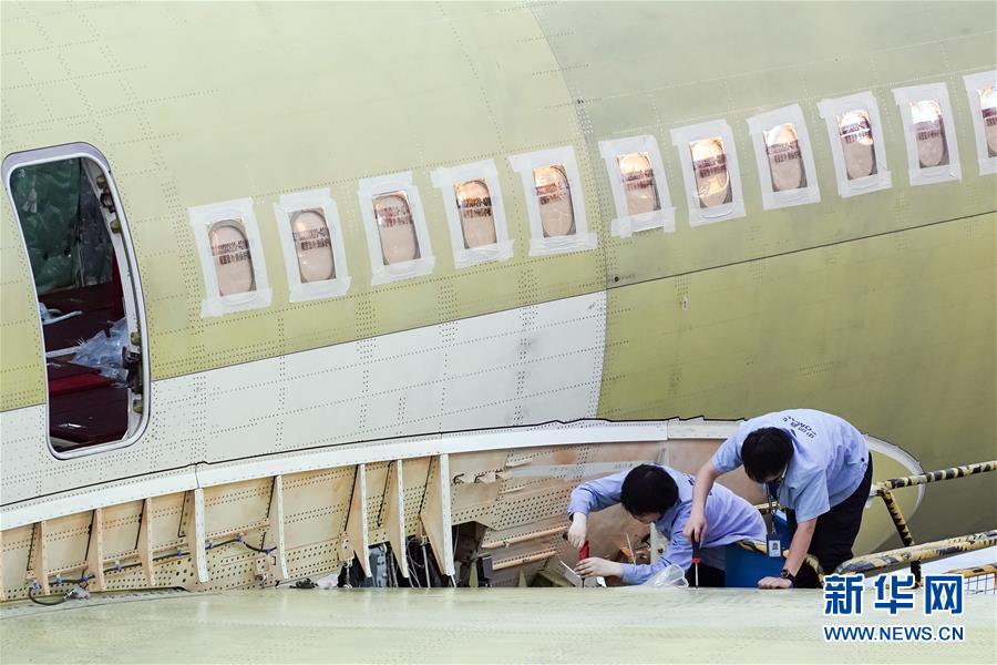 工人在中国商飞上海飞机制造有限公司的C919总装生产线进行装配(7月5日摄)。小到牙刷、电池,大到汽车、轮船、大飞机……改革开放40年,中国制造坚持开拓,苦练内功,在与世界贸易伙伴携手共进中,逐渐融入全球贸易体系。新华社记者 沈伯韩 摄