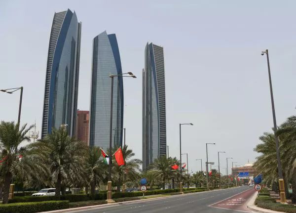7月18日,阿联酋首都阿布扎比的街道两边悬挂着中阿两国国旗。(邬惠我摄)