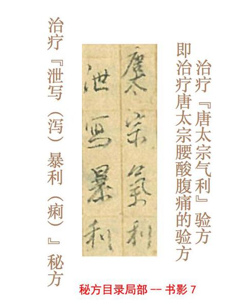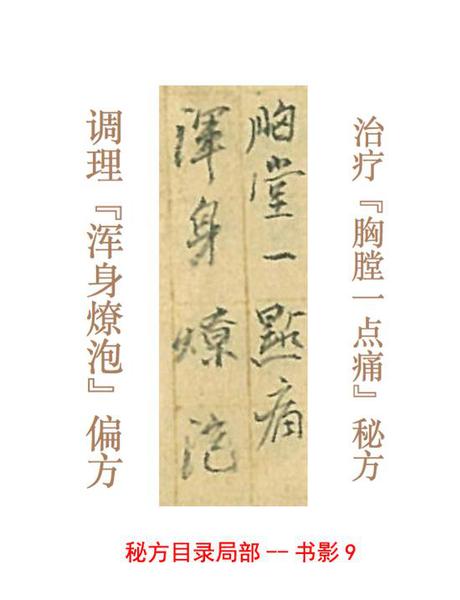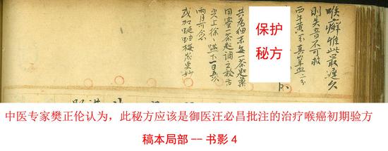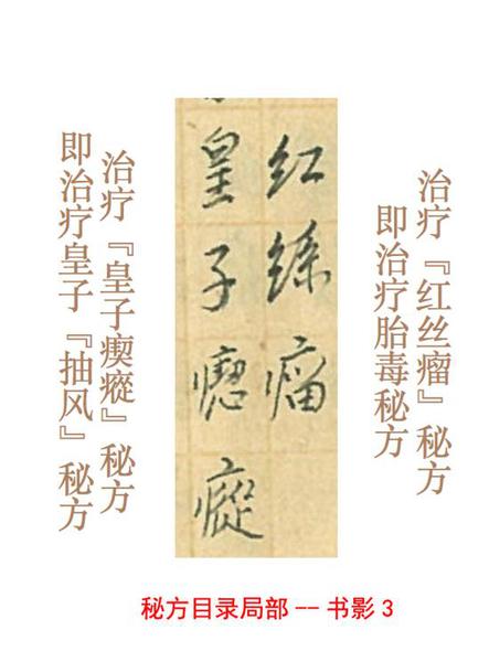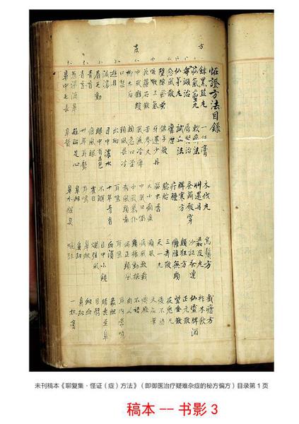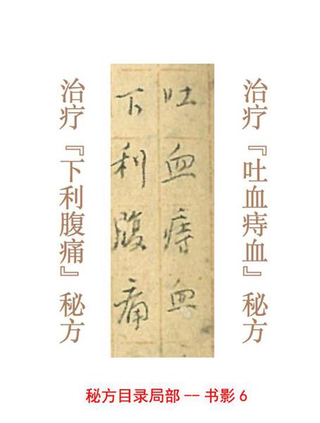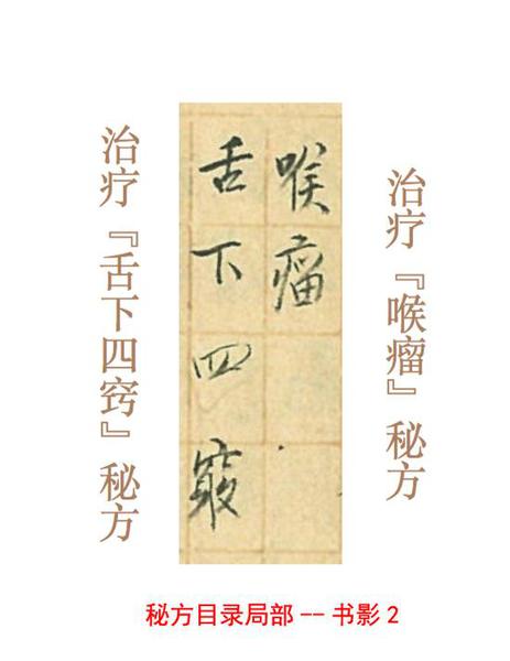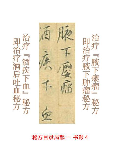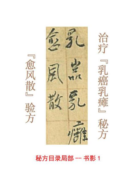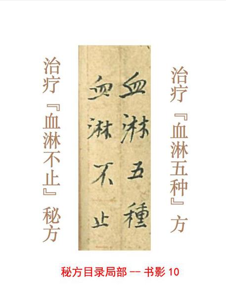 查阅《聊复集·怪症汇纂》四种未刊稿之《怪症方法目录》,此未刊稿本中御医汪必昌记载有治疗“乳癌乳瘫”(秘方目录局部--书影1)、“喉瘤”(恶性即喉癌,见稿本局部--书影4和秘方目录局部--书影2)、“红丝瘤”(秘方目录局部--书影3)、“腋下瘿瘤”(秘方目录局部--书影4)、“遍体痛”(有皮肤癌之可能,见秘方目录局部--书影5)、“吐血痔血”(疑为胃癌或肝癌,见秘方目录局部--书影6)、“泄泻暴利”(疑为肠胃癌变,见秘方目录局部--书影7)、 “痘疮黑靥”(疑为肾癌,见秘方目录局部--书影8)、“浑身燎泡”(疑为淋巴癌,见秘方目录局部--书影9)和“血淋不止”(疑为肾癌,见秘方目录局部--书影10)等10种以上治疗癌症肿瘤的秘方偏方。