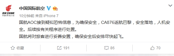 中新网7月26日电 据中国国际航空公司官方微博消息,国航AOC接到疑似恐怖信息,为确保安全,CA876返航巴黎,安全落地,人机安全。后续按有关程序进行处置。国航将对旅客进行妥善安置,确保安全后安排尽快起飞。