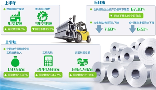 今年以来,国内宏观经济稳中向好,钢铁供需基本平衡,钢材价格比较稳定,优势产能继续得到有效发挥。最新数据显示,上半年我国粗钢产量达4.51亿吨,同比增长6.0%;累计出口钢材3453万吨,同比下降13.2%。从重点钢企看,上半年中钢协会员钢铁企业实现销售收入1.97万亿元,同比增长15.33%;实现利税2144.93亿元,同比增长103.77%。