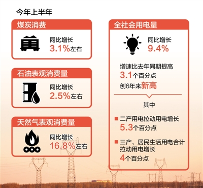 上半年全国煤炭消费稳中有升,同比增长3.1%左右,发电用煤大幅增长,成为煤炭消费增长的主要拉动力量;石油消费保持平稳,表观消费量同比增长2.5%左右;天然气消费大幅增长,表观消费量同比增长16.8%左右;全社会用电量同比增长9.4%,增速比去年同期提高3.1个百分点,创6年来新高。其中,二产用电增速持续回升,拉动用电增长5.3个百分点;三产、居民生活用电保持两位数增长,合计拉动用电增长4个百分点。
