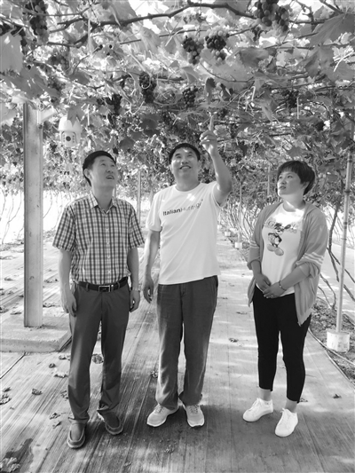 张保国(中)在农场看果树生长情况。