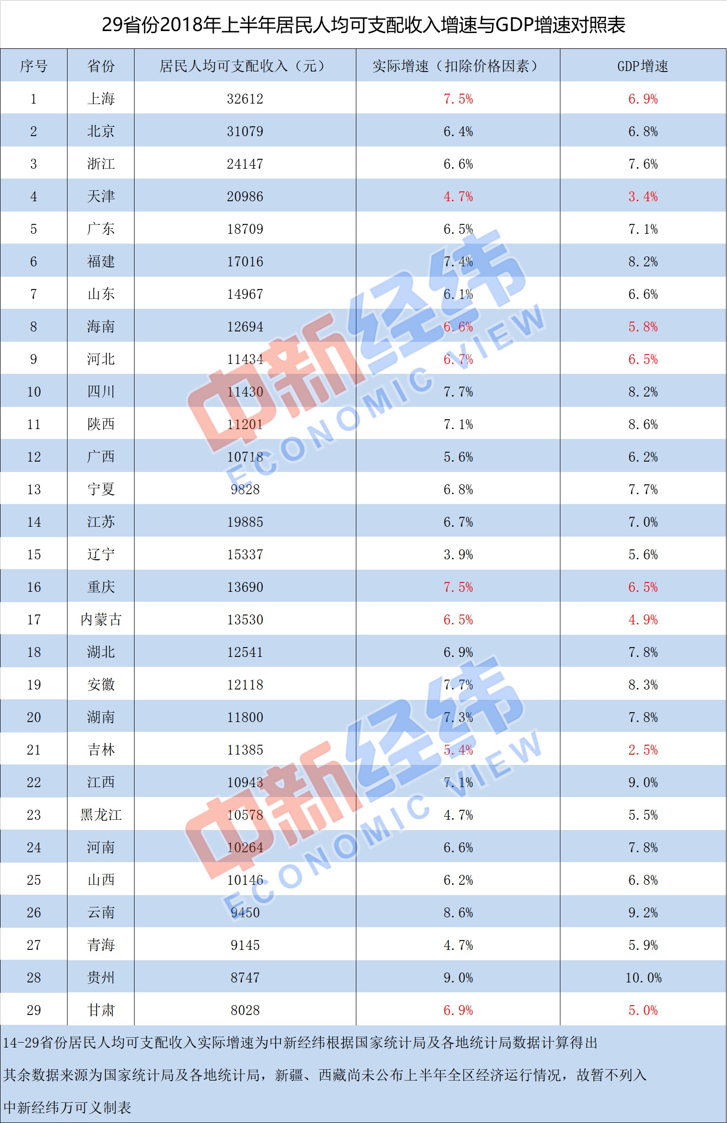 中新经纬客户端8月5日电 (万可义)除了西藏和新疆,目前全国已有29个省份揭晓上半年经济数据。中新经纬客户端经过梳理和统计发现,其中上海、天津、重庆、内蒙古、海南、河北、吉林、甘肃等8个省份上半年居民人均可支配收入实际增速(扣除价格因素)跑赢当地GDP增速;贵州和云南的人均可支配收入实际增速居全国前列,分别为9%和8.6%。