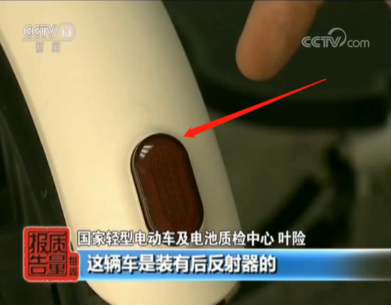 国家轻型电动车及电池质检中心 叶险:我们可以看到这辆车,这辆车是装有后反射器的,所以它可以使得后方的机动车发现它。而这辆车它后方其实是没有反射器的,我们看这个好像是疑似反射器,但它仅仅只是一张贴纸,我们一次就可以把它撕下来,它是起不到任何反射作用。所以这辆车的话,是没有保证它的骑行者的安全的。