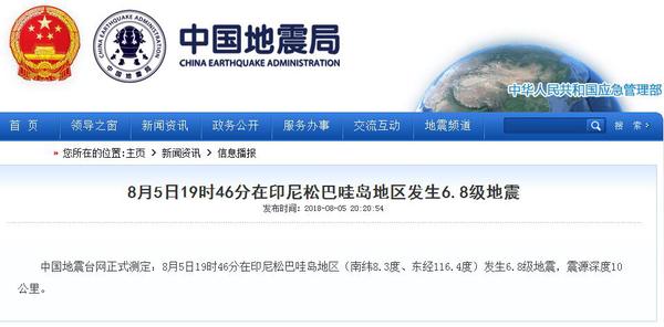 中国地震台网正式测定:8月5日19时46分在印尼松巴哇岛地区(南纬8.3度、东经116.4度)发生6.8级地震,震源深度10公里。