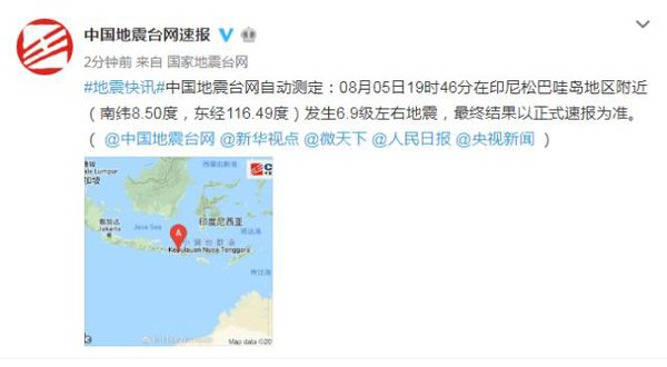 中国地震台网正式测定:8月5日19时46分在印尼松巴哇岛地区(南纬8.3度、东经116.4度)发生6.8级地震,震源深度10公里。