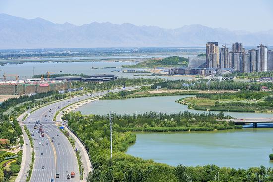 宁夏银川市阅海湿地公园全景。新华社记者王鹏摄