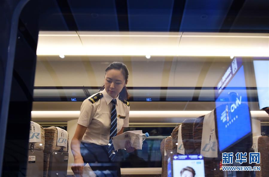 2018年7月10日,10年前首趟京津城际列车的列车长徐颖在京津城际列车内整理车厢。新华社记者 李然 摄