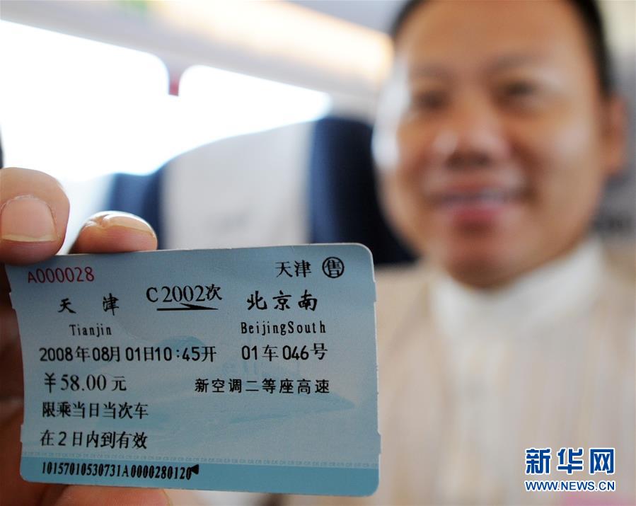 2008年8月1日,京津城际高速铁路正式开通运营。这是乘客在京津城际列车上展示当日车票。新华社记者 王晔彪 摄