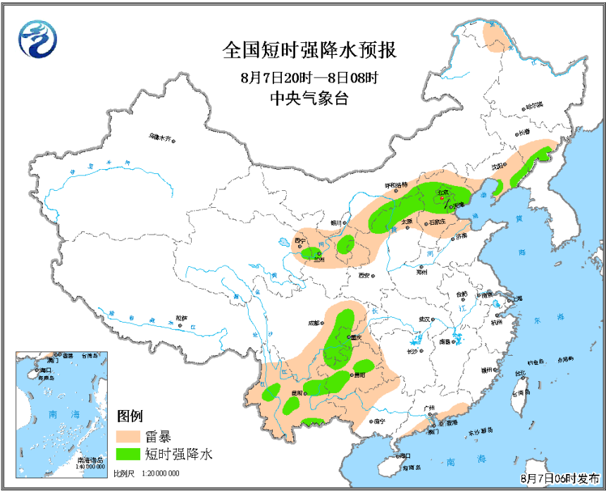 预计8月7日08时至8日08时,内蒙古中南部、吉林东部、辽宁中东部、青海东部、甘肃东南部、宁夏中南部、陕西北部、山西中北部、河北中北部、北京、天津、湖南中西部、浙江南部、四川东部、重庆、贵州、云南、广西北部、广东南部等地的部分地区将有短时强降水天气,小时雨强20-50毫米,局地可达 60毫米以上;另外,陕西北部和山西北部等地的局地将有雷暴大风或冰雹天气。