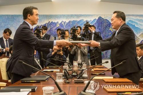 资料图:6月1日,在板门店韩方一侧的“和平之家”,韩朝在高级别会谈后交换联合公报文本。(图片来源:韩联社)