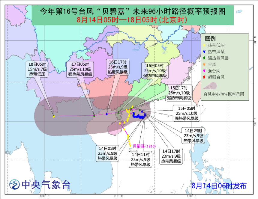 据中央气象台网站消息,中央气象台8月14日6时继续发布台风蓝色预警:今年第16号台风“贝碧嘉”预计今天白天将在广东西部近海徘徊,今天夜间开始逐渐转向偏西方向移动,趋向粤西沿海,强度还将有所加强,最大强度可达强热带风暴级。