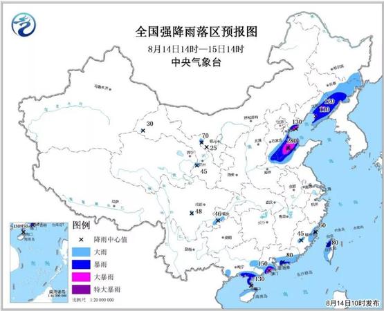 14日10时,中央气象台继续发布暴雨黄色预警:预计,8月14日14时至15日14时,河南、河北、山东、辽宁等地有大暴雨;甘肃中东部、重庆西南部等地局地有分散性大雨或暴雨。明天,华北、东北地区雨势减弱,但台风“摩羯”及“贝碧嘉”仍将为河南、广东、广西等地带来强降雨。