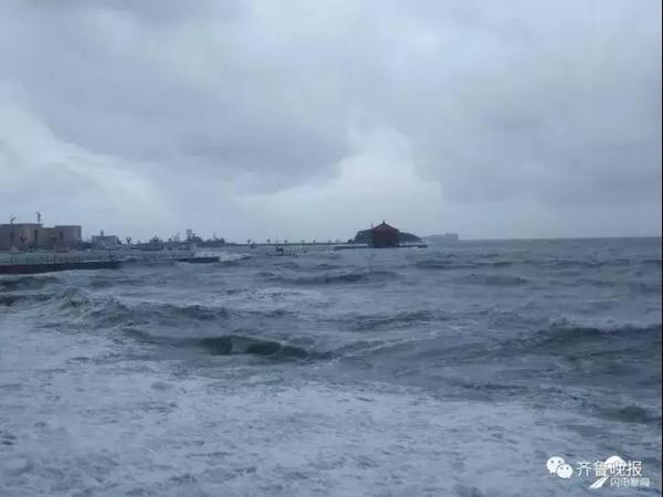 △受台风外围影响,青岛海滨著名景点栈桥桥面13日被淹没,青岛栈桥景区暂时关闭。