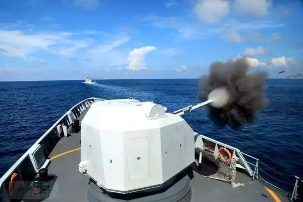 ▲编队主炮对岸射击,图为056型护卫舰泸州舰(舷号592)舰炮射击。(军报记者网站)