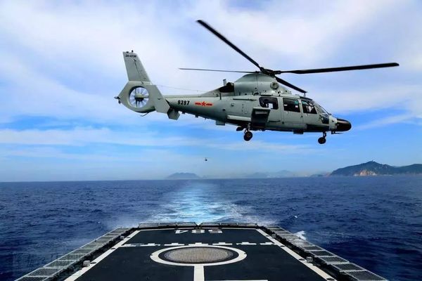 ▲演习中,直-9直升机从中国海军056型护卫舰梅州舰(舷号584)上起飞。(军报记者网站)