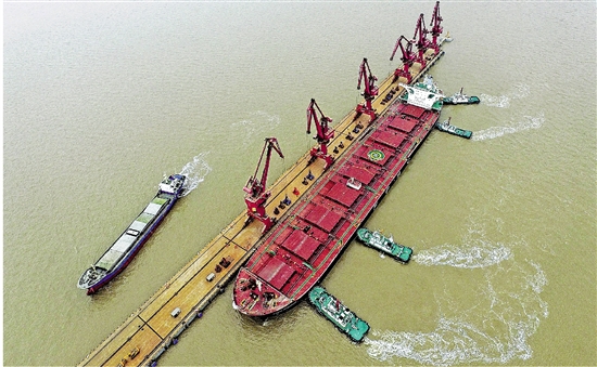 安徽马鞍山,2018年4月9日15时许。随着一声汽笛鸣响,满载着2万吨铁矿砂的中国首艘2万吨级江海联运直达船——“江海直达1”号靠泊安徽马鞍山马钢港务原料总厂码头,完成首航。