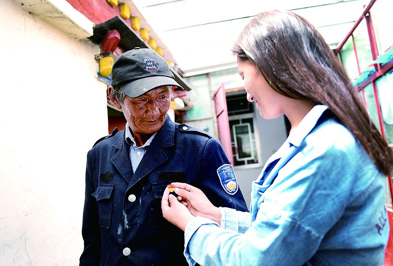 旺扎是多年的老党员,女儿阿旺卓玛为他佩戴党徽