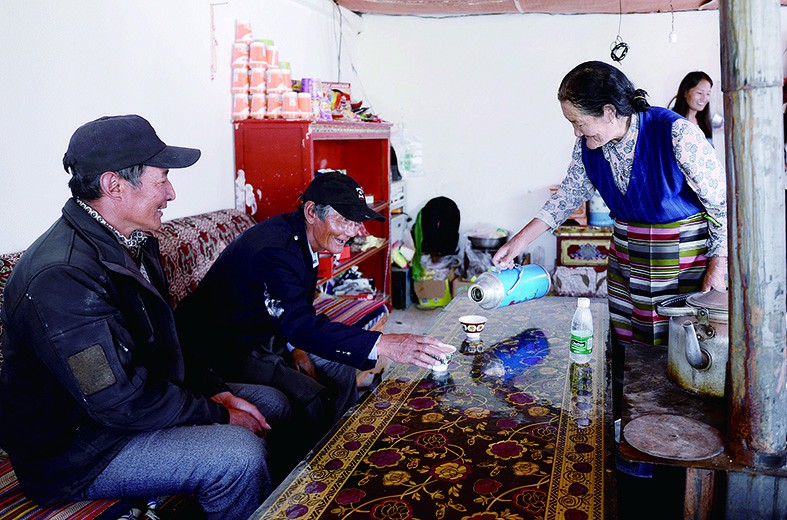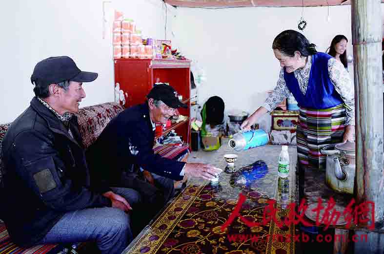 街坊邻居到旺扎家做客,夫妻都会亲手熬制热乎乎的奶茶招待