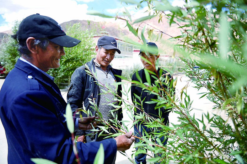 每天早出晚归、风吹日晒,一周5天每天都要给树苗浇水。在旺扎的精心呵护下,小树苗居然成活了,如今几年前栽种的班功柳、红柳、小叶杨早已亭亭玉立、绿茵满地,新引种的山杏也长出了新枝。正值盛夏,绿树成荫、屋舍俨然的典角村,成为边境线茫茫荒原上一道靓丽的风景线。