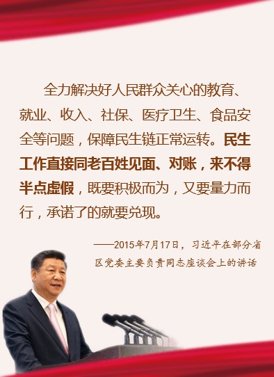 要着力保障民生建设资金投入,全力解决好人民群众关心的教育、就业、收入、社保、医疗卫生、食品安全等问题,保障民生链正常运转。民生工作直接同老百姓见面、对账,来不得半点虚假,既要积极而为,又要量力而行,承诺了的就要兑现。