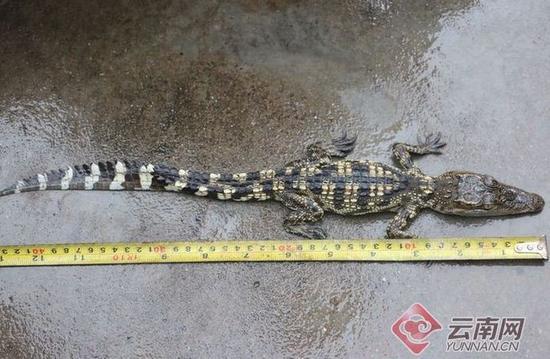 据岩共介绍,8月11日下午,他干完农活回家时,在县城附近的南垒河听到嗷嗷叫声,于是上前查看,发现居然是两条小鳄鱼。出于好奇,他把两条鳄鱼带回家养了起来,当晚他越想越觉得不对劲,于是在第二天早上打电话向孟连县森林公安局报警。