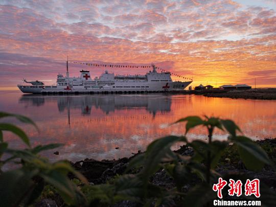 图为2018年8月19日首个“中国医师节”,在汤加努库阿洛法港,沐浴朝霞的中国海军和平方舟医院船