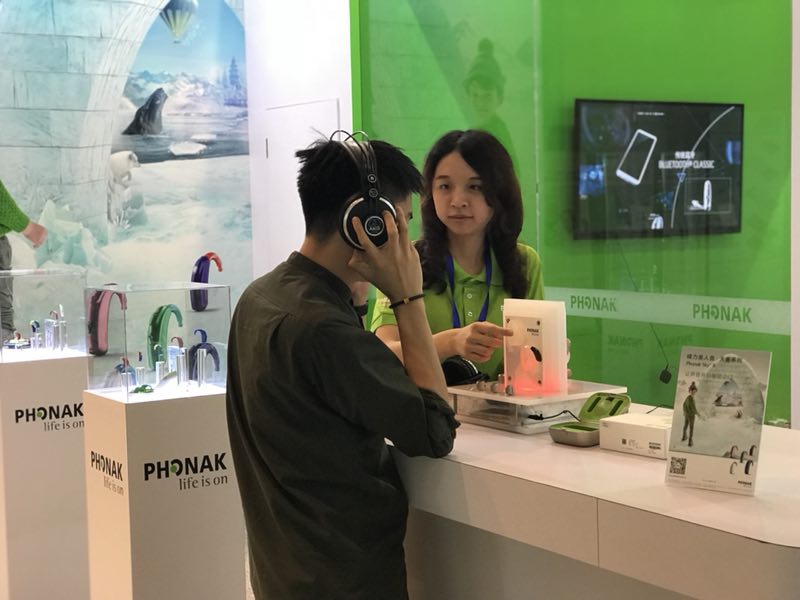 在2018中国听力语言论坛展会上,消费者体验峰力神通系列助听器