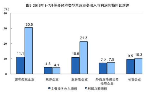 1-7月份,规模以上工业企业中,国有控股企业实现利润总额11913.2亿元,同比增长30.5%;集体企业实现利润总额125.2亿元,增长4.1%;股份制企业实现利润总额27801亿元,增长21.3%;外商及港澳台商投资企业实现利润总额9422.4亿元,增长7.5%;私营企业实现利润总额10215.1亿元,增长10.3%。