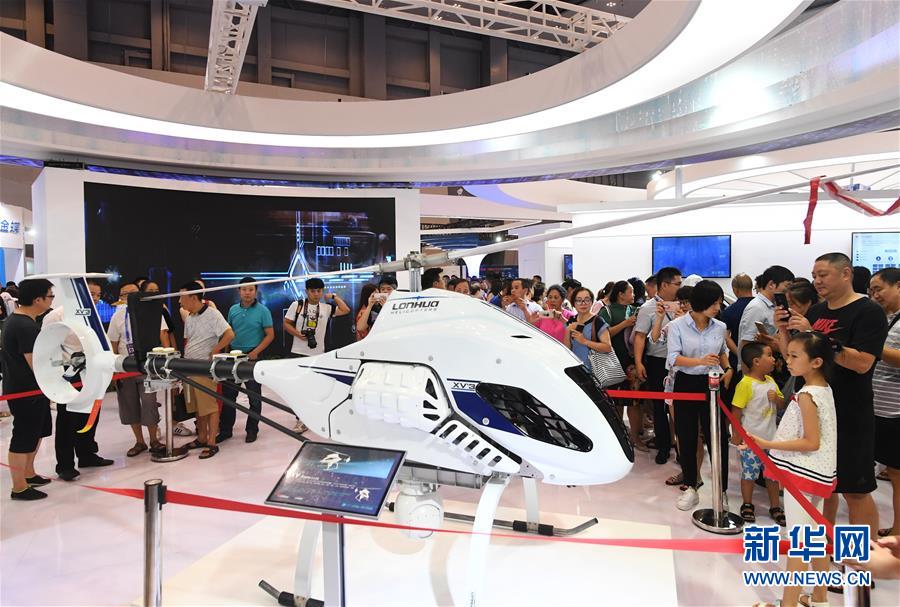 8月24日,观众在2018中国国际智能产业博览会上参观通用型无人直升机。 新华社记者 王全超 摄