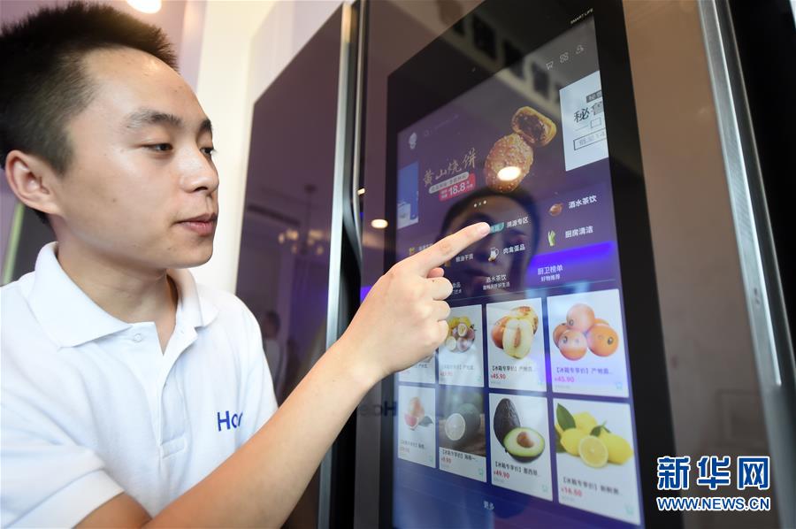 8月24日,“智慧小镇”工作人员在智博会现场展示智能冰箱的功能。 新华社记者 唐奕 摄