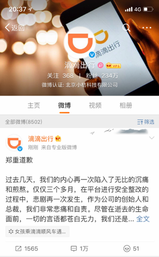滴滴出行发布道歉信,全文如下: