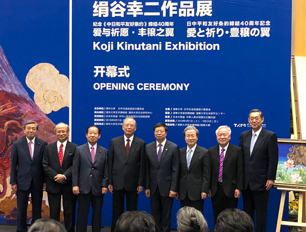开幕式上,二阶俊博宣读了日本首相安倍晋三致绢谷幸二的感谢信。中国驻日大使程永华,日本驻华大使横井裕,清华大学原校长顾秉林,日本自民党干事长代理林干雄等出席活动。绢谷幸二先生向清华大学艺术博物馆捐赠了作品《莲华梦谭》,清华大学艺术博物馆常务副馆长杜鹏飞向绢谷幸二先生颁发了捐赠证书。