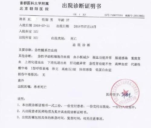 然而,病情发展迅速,仅2天后,王某就被宣布死亡,主要诊断为急性髓系白血病,同时其他诊断还显示:急性早幼粒细胞白血病、重度贫血、肝功能异常、高钾血症、代谢性酸中毒、急性肾功能不全、I型呼吸衰竭等多种病症。