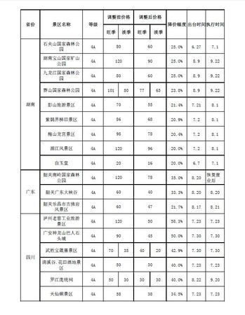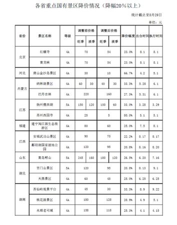 国家发改委发布消息,截至8月29日,已有21个省区市出台了(已实施或发文对外公布)157个景区降价(免费开放)措施,25个省区市确定了“十一”前拟降价(免费开放)的157个景区名单,合计314个景区中,5A级景区121个、4A级景区155个;按降价幅度统计,实行免费开放的景区30个,降幅在30%(含)以上的29个、在20%(含)—30%的48个??炖纯纯从忻挥心阈囊堑牡胤??