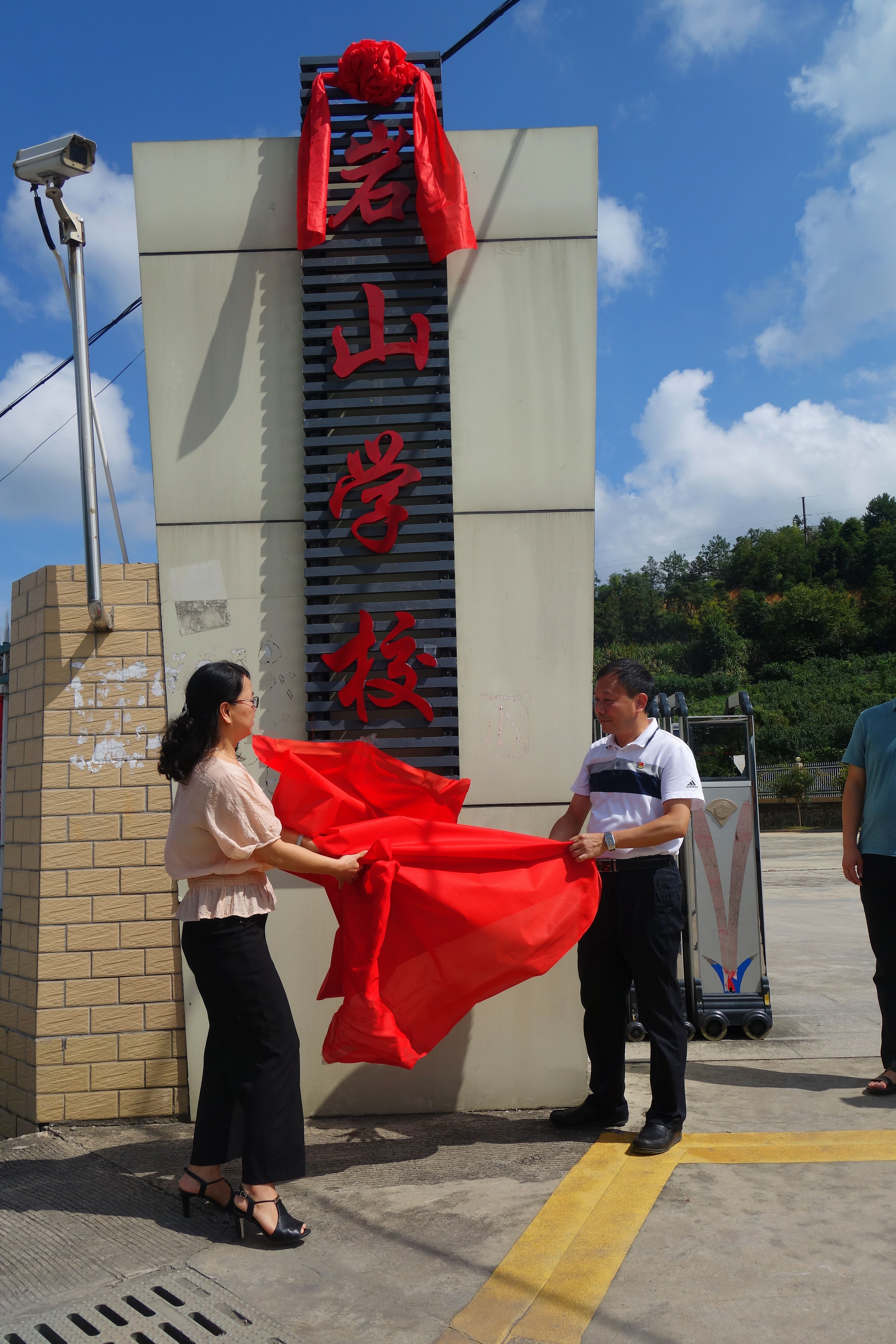 图1:新罗区政协副主席、民盟新罗区工委主委黄美玲(左)与岩山镇镇长李承清为复办的岩山中学揭牌。