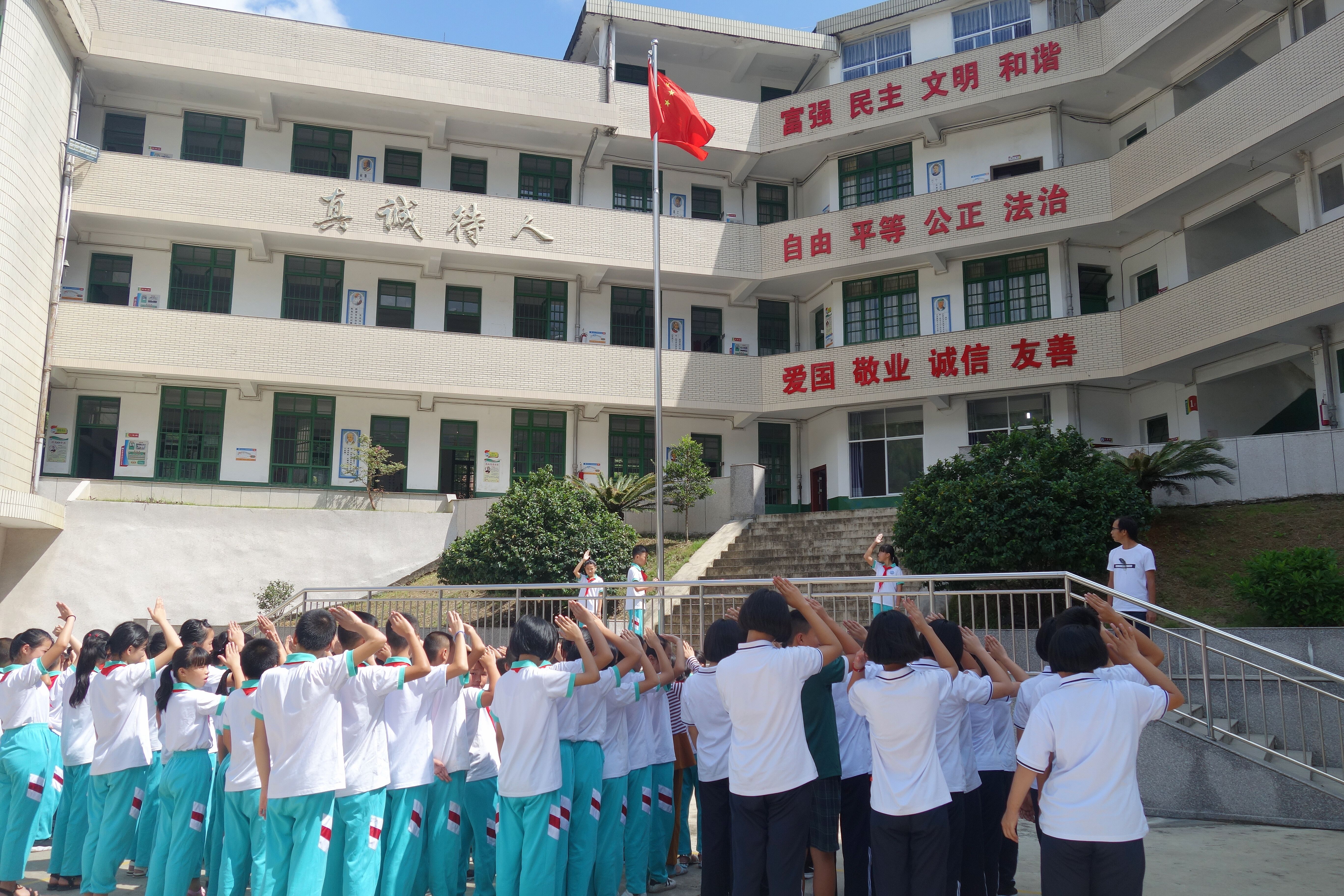图2:开学第一天,岩山中学学生与岩山小学学生一起升国旗。