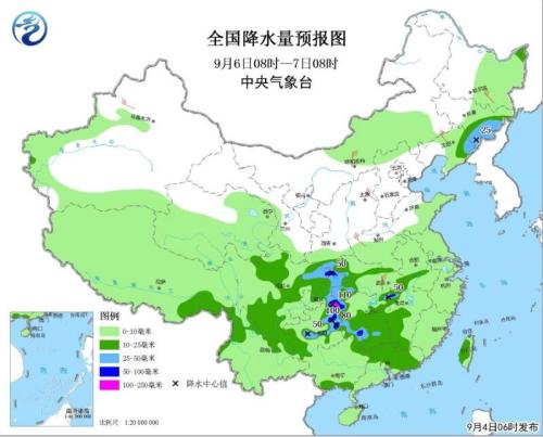 9月6日08时至7日08时,吉林中东部、辽宁东北部、陕西南部、湖北中西部、湖南西部和中南部、重庆大部、四川盆地大部、贵州西部和东部、云南北部、江西西部、安徽中部、广西南部、广州中东部等地的部分地区有中到大雨,其中,四川盆地东北部、重庆北部和东南部、贵州东北部、湖南西南部、江西西北部局地有暴雨或大暴雨(100~110毫米);新疆北部、内蒙古中部、东北大部、华北南部、河南西部、湖北中部有4~6级风(见图3)。