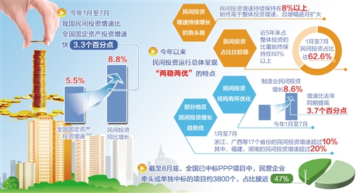 “两稳”,一是民间投资增速持续增长的势头稳。今年以来,民间投资增速持续保持在8%以上,始终高于整体投资增速,且增幅逐月扩大;二是民间投资占比稳,近5年来占整体投资的比重始终保持在60%以上,今年1月至7月,民间投资占全部投资的比重达到62.6%。
