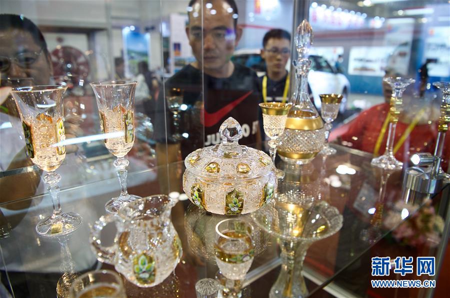 9月8日,观众在第二十届中国国际投资贸易洽谈会捷克展区观看捷克水晶工艺品。