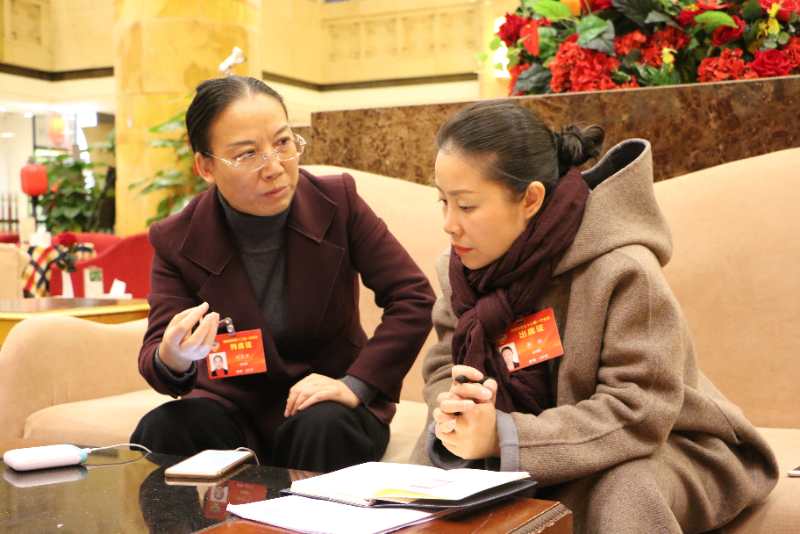 湖南省政协十二届一次会议期间,江永县政协主席刘忠华(左)与湖南省政协委员李雨(右)就女书文化传承与保护进行交流。