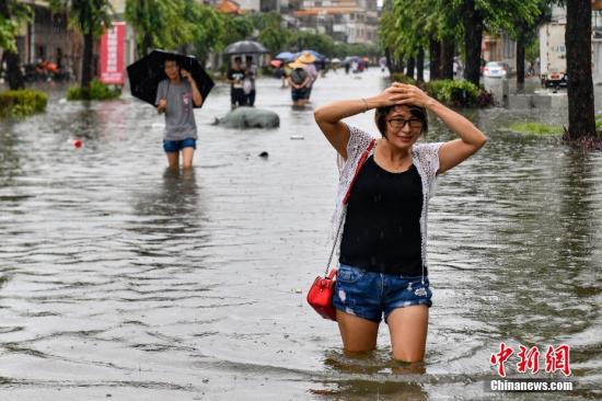 资料图:台风过境民众涉水出行。中新社记者 陈骥旻 摄
