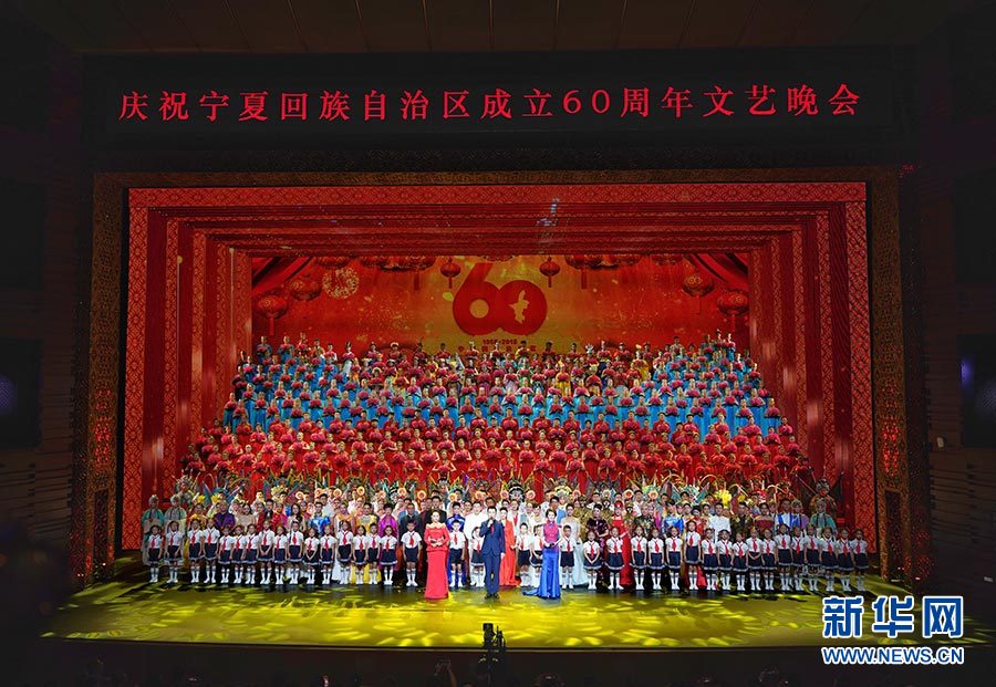 新华社银川9月19日电(记者许可、谭谟晓)19日晚,宁夏人民剧院载歌载舞、笑语盈盈。庆祝宁夏回族自治区成立60周年文艺晚会《绽放新时代》在这里精彩上演。中共中央政治局常委、全国政协主席、中央代表团团长汪洋和各族各界干部群众等共约1400人观看演出。